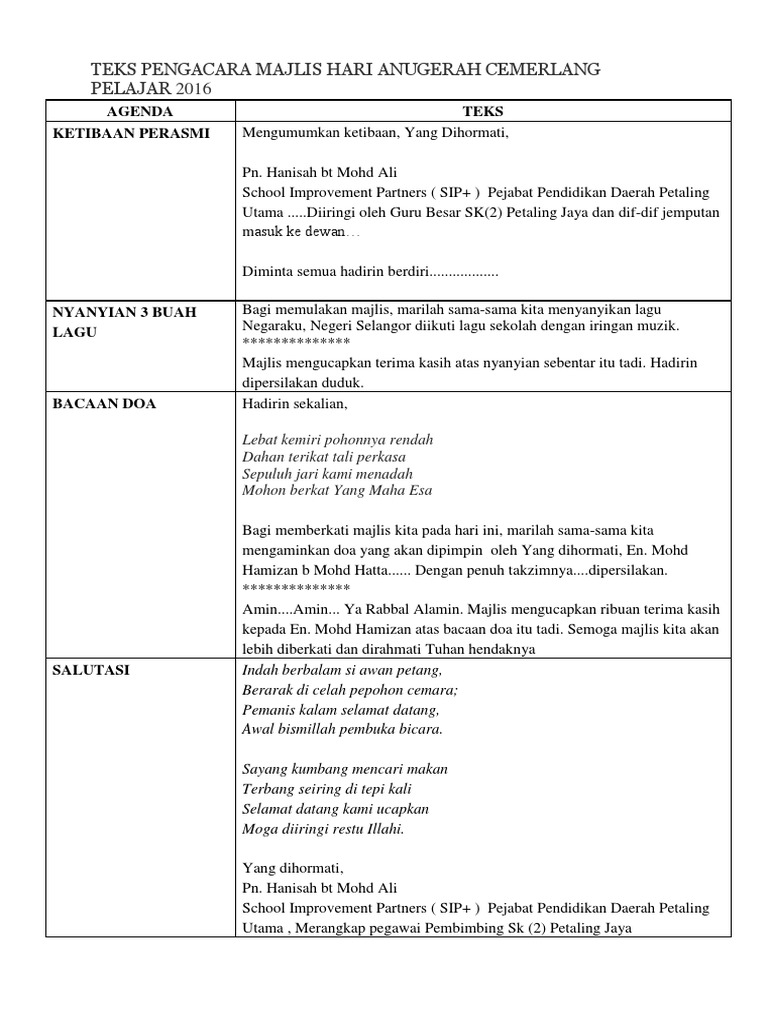 Mc atau master ceremony adalah seseorang yang memimpin jalannya sebuah acara, baik acara formal atau acara non formal. Majlis anugerah kecemerlangan pelajar bagi tahun 2013 sk permas jaya 4 pada hari ini akan kita mulakan dengan penyampaian anugerah khas pra sekolah dan anugerah nilam. Dapatkan teks pengerusi majlis anugerah kecemerlangan. Majlis penyampaian anugerah kecemerlangan pelajar tingkatan 1, 2 dan 4 bagi tahun. Majlis anugerah kecemerlangan pelajar 2009.