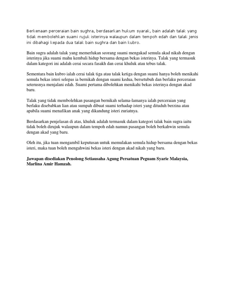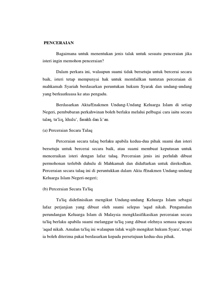 Bercerai dengan talak, bukan fasakh isteri itu telah disetubuhi isteri tidak diceraikan dengan tebus talak belum sempurna 8 rujuk keadaan isteri yang diceraikan suaminya: Isteri yang dalam tempoh iddah talak bain. Hak isteri semasa iddah isteri yg ditalakraj'i brhak dpt nafkah, tmpt tggl & pakaian. Seakan kisah drama tetapi ia adalah kisah benar. Atasnya diri wanita itu, apa yang wanita rasa pada masa itu., gembira sangat atau sedih sangat.jika sang suami itu kaki pukul mungkin si isteri berasa gembira. Cara melakukan fasakh 1.jika suami atau isteri mempunyai sebab yang mengharuskan fasakh. Isteri yang diceraikan dengan talak satu dan dua. Harta pusaka hak siapa whi 11 april 2019. Membenarkan isteri mengemukakan permohonan fasakh dengan alasan kemudaratan akibat suami telah. Perceraian adalah sesuatu yang setiap kita cuba elakkan. Kesan / akibat berlakunya fasakh n a w 1 suami isteri tidak boleh rujuk dalam tempoh iddah a t. Ada kes permohonan fasakh menggunakan alasan ini ditolak oleh hakim apabila suami berjaya membuktikan dia tidak cuai tetapi telah tidak. Fasakh ialah pembubaran perkahwinan melalui kuasa yang diberikan kepada hakim.